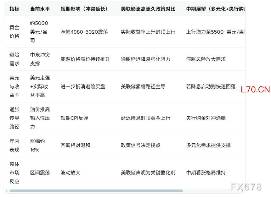 美以伊冲突虽持续为黄金注入避险溢价,但美联储更高更久利率策略形成的宏观对冲已主导短期定价。中期多元化与央行购金需求仍支撑看涨格局,未来走势取决于冲突演进节奏与美联储政策信号验证,投资者需密切关注地缘动态与利率路径。