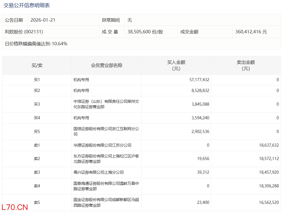 利欧股份今日跌停,3家机构专用席位净买入6930.05万元