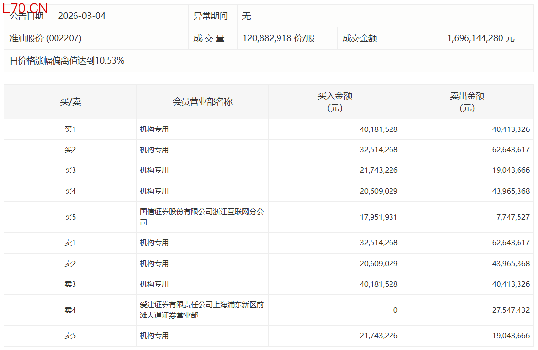 准油股份今日涨停,有3家机构专用席位净卖出5371.75万元