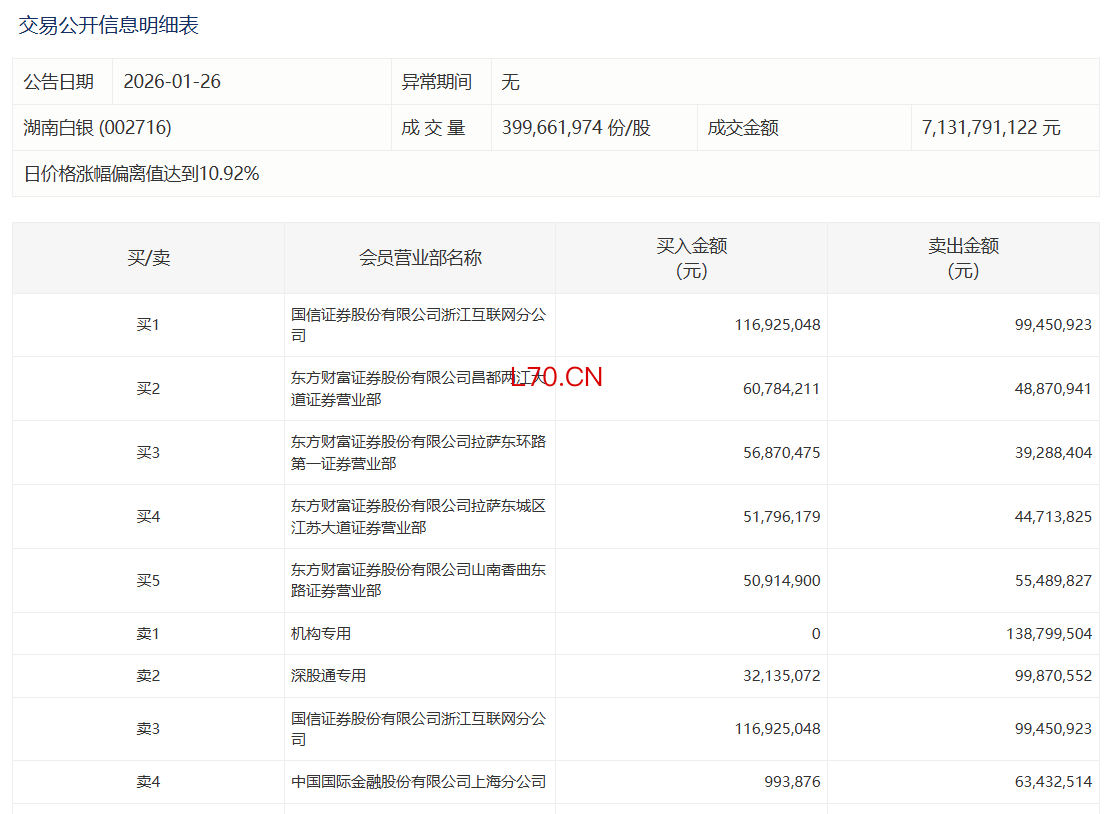 湖南白银今日涨停,有1家机构专用席位净卖出1.39亿元