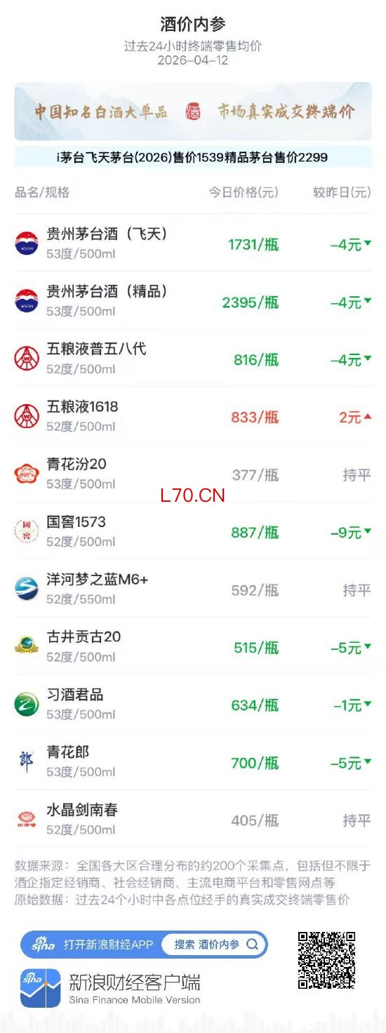 配资炒股“酒价内参”每日数据源自全国各大区均有合理分布的约200个采集点,包括但不限于酒企指定经销商、社会经销商、电商平台和零售网点等,原始取样数据为过去24个小时各点位经手的真实成交终端零售价,力求为各界提供一份关于知名白酒市场价的客观、科学、全程可追溯数据。随着元旦官方i茅台平台开售1499元/瓶的飞天茅台(3月31日凌晨上调至1539元/瓶),1月9日开售2299元/瓶的精品茅台,这一新渠道对两款产品终端零售均价的磁吸式影响力逐步显现。“酒价内参”每日发布的酒价遵循对真实成交量加权的计算规则,我们已将可确量的价格引入两种酒品终端零售价的计算中。