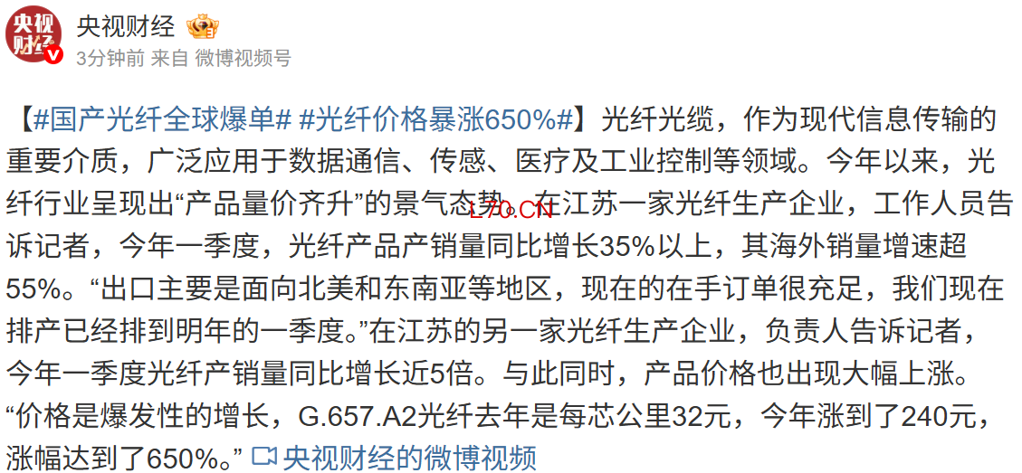 国产光纤全球爆单 部分产品价格暴涨650%