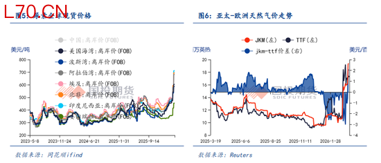 中东局势带动全球天然气价格出现大幅的飙升。2026年2月28日起截至3月17日HH(美国)天然气价格从2.859上涨到3.033,涨幅为6.09%。JKM(亚太)价格从10.725上涨到19.41,涨幅为80.98%。TTF(欧洲)价格从11.0571上涨到17.534,涨幅为58.58%。亚洲和欧洲气价涨幅较大。由于中东化肥主要原料是天然气(制造路径如下:天然气-合成氨-尿素,合成氨+磷矿石+硫酸制成磷肥),中东市场在尿素和磷肥上出口占比大,所以带来了新季作物的肥料供应中断以及成本提升的风险。以美国尿素为例,截至3月17日,美国尿素大颗粒现货FOB价格突破600美元/吨,较战争开始前上涨27.4%。从肥料投入的成本看,美国、巴西及印度市场尿素和磷肥用量在玉米、小麦占比偏大。美国和巴西的大豆在磷肥和钾肥上用量占比大。马来印尼棕榈油需要钾肥、磷肥和氮肥。后续新季作物一方面要关注成本的抬升,一方面要关注肥料短缺对单产的影响。