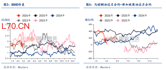 生物柴油与石化柴油的价差缩小,生物柴油的经济性凸显,间接提振植物油价格上涨。从国际柴油市场来看,2026年2月28日起,截至3月17日,新加坡10PPM柴油FOB价格从92.9上涨到198.22美元/桶,涨幅为113.3%,美国柴油平均价格从3.76美元/加仑上涨到5.04美元/加仑,涨幅为34.04%。欧洲鹿特丹FOB柴油从99.86美元/桶上涨到164.26美元/桶,涨幅为64.49%。能发现亚洲区域的柴油涨幅最大。2026年2月28日起截至3月17日,新加坡柴油10ppm柴油裂解利润从21.9美元/桶上涨到48.46美元/桶,涨幅为121.28%。美国BOHO(美豆油和美燃油)价差近期从2.06下跌至1.21美元/加仑,价差下跌41.26%,美豆油跟美燃油价差缩小,利于提升美豆油的生柴生产优势。由于亚洲柴油市场最为强势,亚洲市场棕榈油和新加坡柴油价差缩小较大,更加凸显了其生物柴油价值,马棕油和新加坡柴油近月合约价差出现大幅下跌,从333美元/吨下跌至24.7美元/吨,价差下跌92.58%。另外,在能源格局紧张局势下,作为资源国的印尼,释放政策预期,或将因为能源格局紧张而限制棕榈油的出口。因此要注意在全球能源供应链风险增加的情况下,资源优先保护本国的需求,或影响棕榈油的出口。