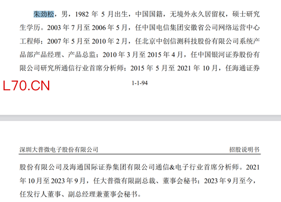 根据招股资料,朱劲松,1982年出生,硕士研究生,2003年至06年在中国电信安徽担任工程师,07年5月至10年2月担任中创信测产品总监,10年跳槽到金融行业,担任中国银河通信首席分析师,2015年至21年在海通证券担任通信和电子首席,在海通证券业绩爆雷被合并前急流勇退加入了大普微,目前担任董事、副总兼董秘。