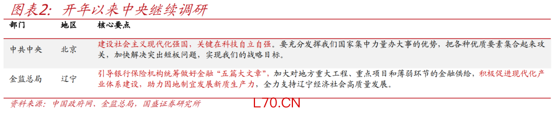 >开年以来中央继续调研,作为“十五五”开局之年,总书记的首次调研选在北京、聚焦科技,强调建设社会主义现代化强国,关键在科技自立自强;此外,金监总局辽宁调研、聚焦金融“五篇大文章”,尤其是积极促进地方现代化产业体系建设、助力因地制宜发展新质生产力。
