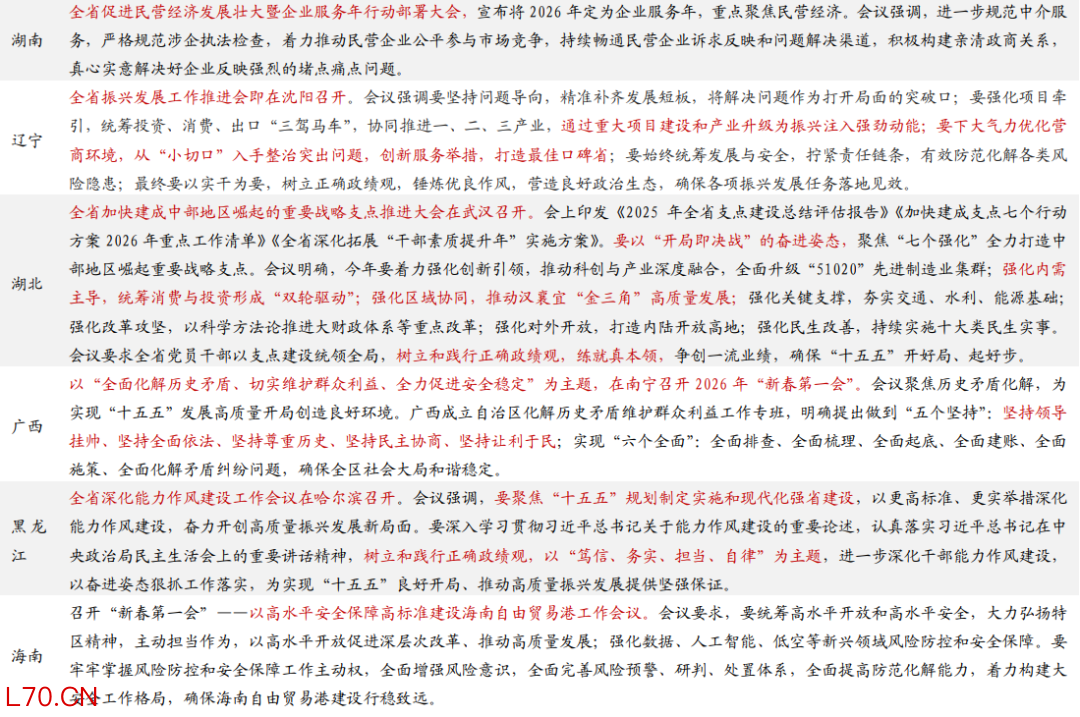 广东、浙江、江苏多地召开“新春第一会”,锚定“十五五”开局之年,定基调、把方向、抓落实,多聚焦新质生产力、民营经济、高质量发展等。其中,广东、安徽、江苏等地聚焦科技创新与高质量发展,福建、湖南聚焦民营经济发展,浙江(“八八战略”、共同富裕)、湖北(中部地区崛起)、海南(自贸港)、江西(农业农村)等各有侧重,主题虽有不同,但多提及鼓励低空经济、具身智能、无人驾驶等新兴产业发展;此外,浙江、辽宁、湖北、黑龙江多地继续强调树立和践行正确政绩观。