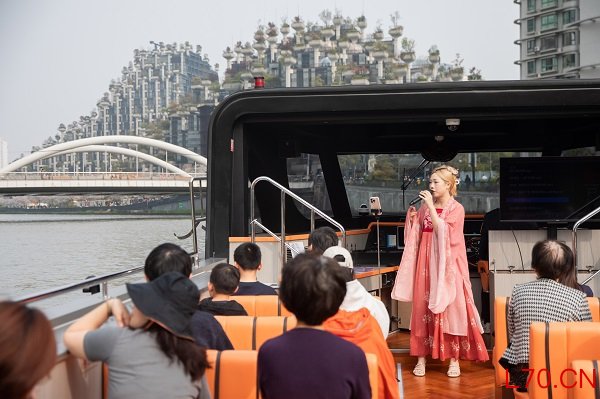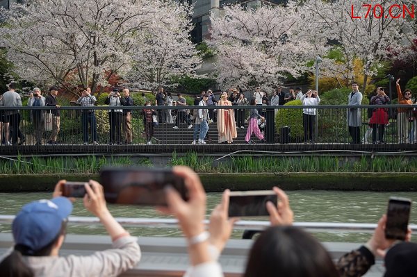 当日15时,樱花演艺航班准时启航,全程敞篷航行至樱花最佳观赏河段。船上歌声与岸边演艺遥相呼应,《春暖花开》《小幸运》等曲目在河面与花枝间婉转回荡。船上游客与岸边行人挥手互动,“你在船上看风景,岸上看你是风景”的浪漫感染着每一位参与者。