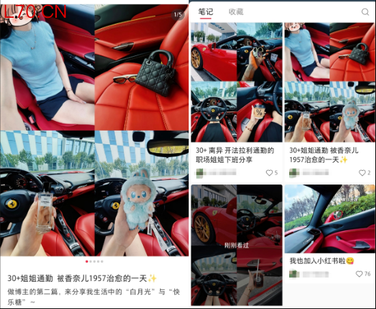 例如,有博主仍以“法拉利”“职场”为关键词打造人设。在其发布的五条帖子中,法拉利跑车连续出现,还配文称研究怎么赚更多钱,疑似意图引起用户焦虑。再比如,还有博主频频发布“开保时捷”的视频,视频封面均为其手握方向盘,并配文“人生是旷野”“28岁是有钱又自由的18岁”“经济自由,人生更自由”等,有用户评论“并不理解(炫耀)是什么心里”。